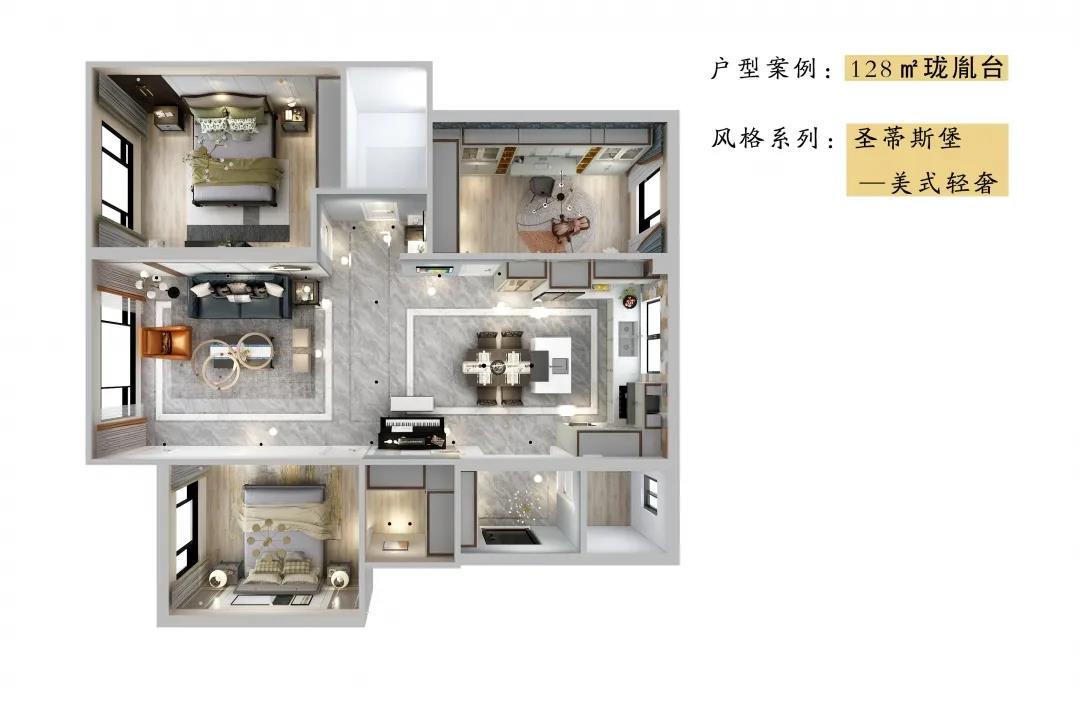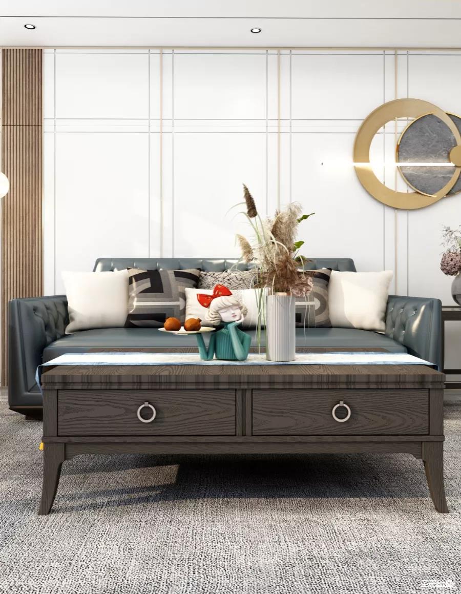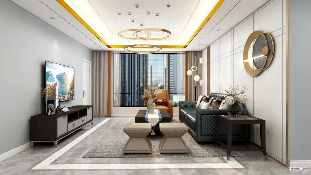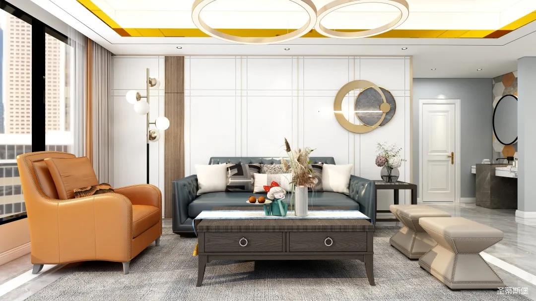 客厅延续着美式轻奢的气韵,背景墙被简约有序的金属线条分割,营造出质感空间的细腻。沙发沉稳又不失时尚,色彩混搭更是让人耳目一新,展现着美式风格天性自由不羁的浪漫个性。