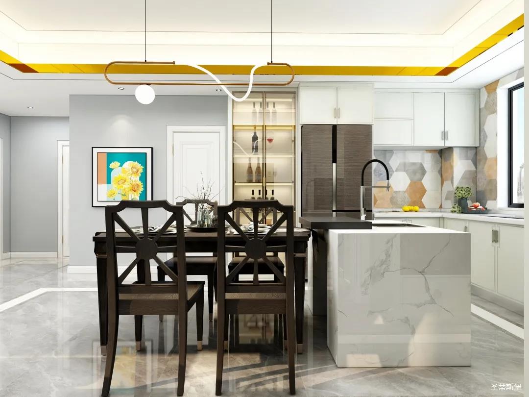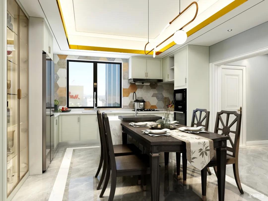 仪式感的餐厨空间,应在自然光影中跳跃。从设计搭配细节将美式开放,不设限的特性显现,实木餐桌线条简约且刚毅,中岛台链接起用餐空间的随性,不遗余力的拉伸空间的层次感。