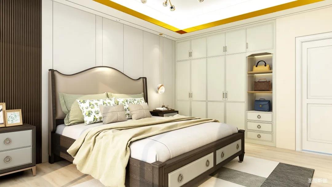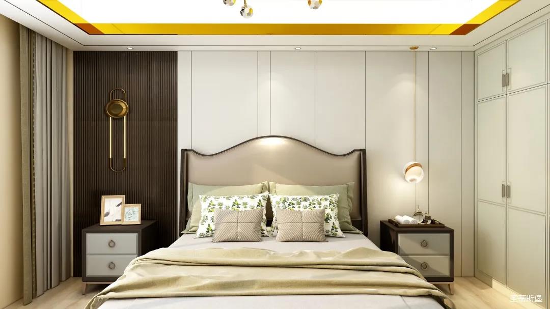 简约象牙白木饰面与棕色线性条纹木饰面等比划分,从色彩装饰上瓜分整个卧室空间,一面简约雅致,一面低调奢美。