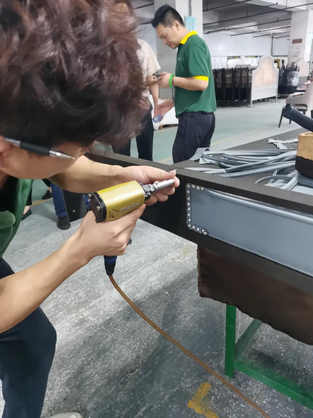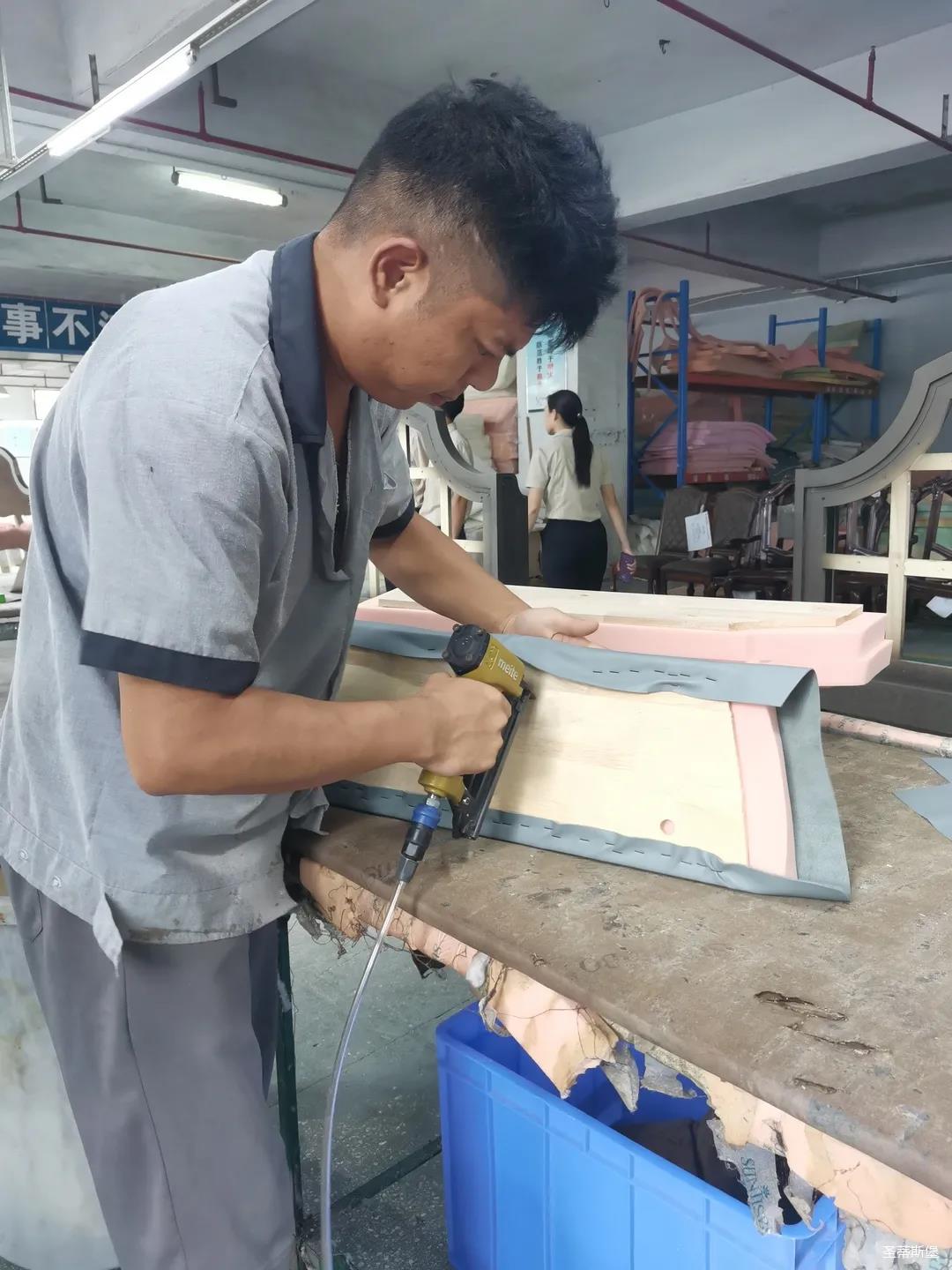 本届技能竞赛设置为工业组和商业组,共设竞赛项目8项,其中,工业组竞赛包含了打滚边、打铜钉、自身产品组装、成品组装、柜体喷底色、修色、板材开料等七大细项。商业组以组装办公台、床头柜为主。