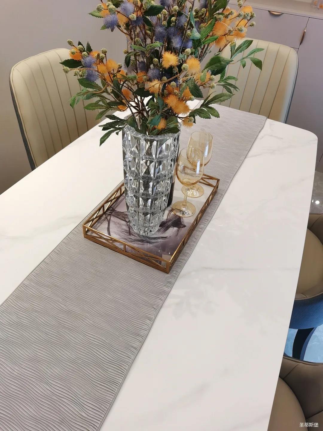 客餐厅虽属同层,但由廊道隔开,各有宽阔的空间格局,加上引入自然光源的采光设计,空间通透明亮。岩板餐桌搭配的真皮餐椅,让不同的材质在在空间完美契合,既增加了空间的时尚氛围,也能给人良好的用餐体验。
